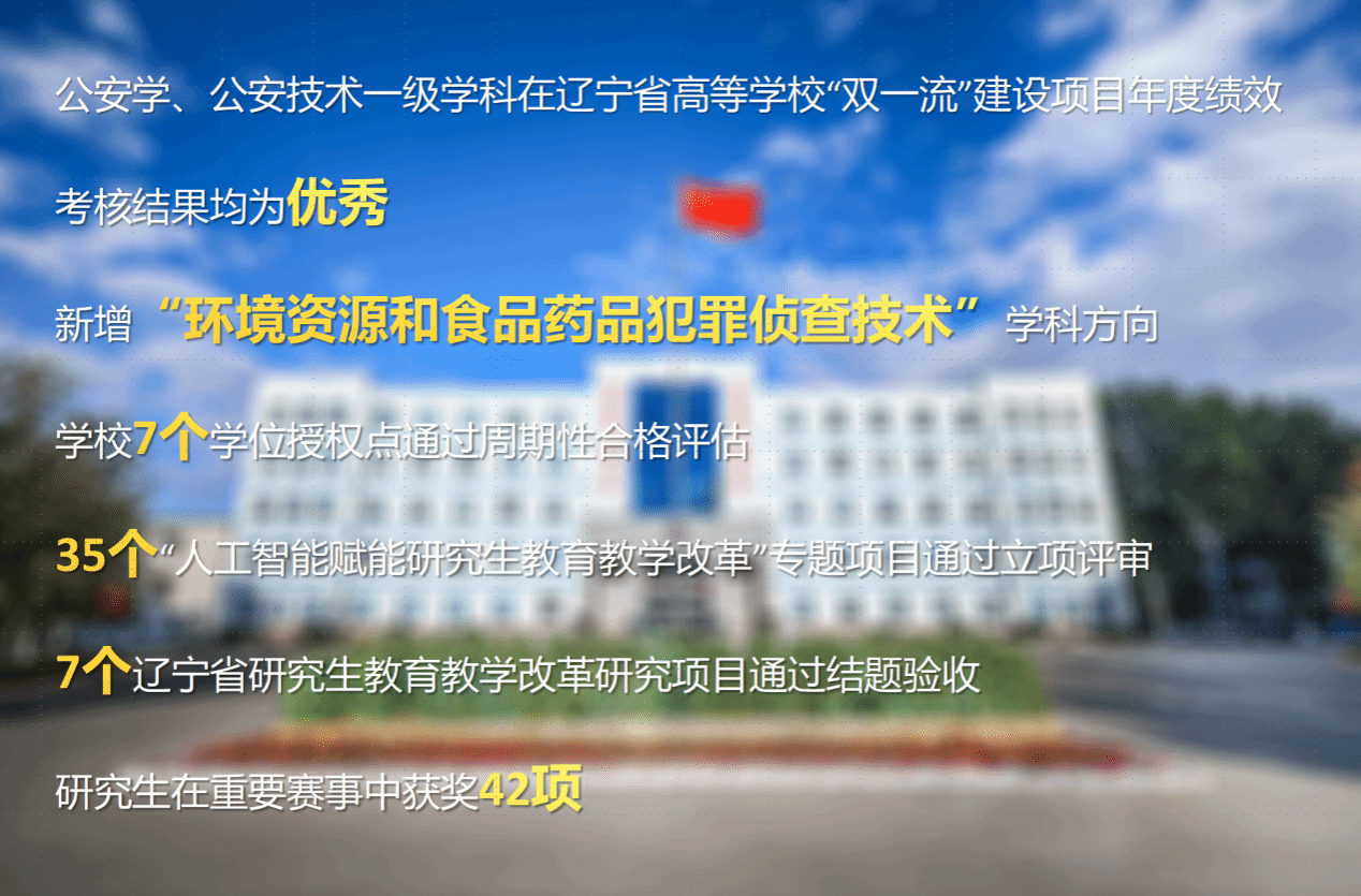 学科建设连续取得突破,统领作用更加凸显。公安学、公安技术一级学科在辽宁省高等学校“双一流”建设项目年度绩效考核工作中,结果均为优秀。新增“环境资源和食品药品犯罪侦查技术”学科方向,学校应用心理学位授权点顺利通过辽宁省教育厅抽评,学校7个学位授权点至此全部通过周期性合格评估。坚持内涵式发展,补短板、强弱项,扎实推进申报博士学位授予单位各项工作。35个“人工智能赋能研究生教育教学改革”专题项目通过立项评审,7个辽宁省研究生教育教学改革研究项目通过结题验收。研究生在第十五届公安院校学生科技应用创新大赛等多项重要赛事中获奖42项,发表学术论文数量和质量显著提升。