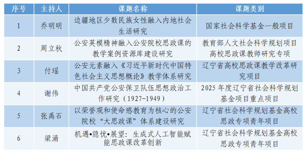 近日,全国哲学社会科学工作办公室、教育部及辽宁省相关部门相继公布2025年科研项目评审结果,马克思主义学院立项工作斩获佳绩,共获批6项高层次项目,创学院立项数量与质量双新高。这一成果,是马克思主义学院深入落实《学校科技兴警三年行动计划方案》,积极推进有组织科研工作取得的丰硕成果。