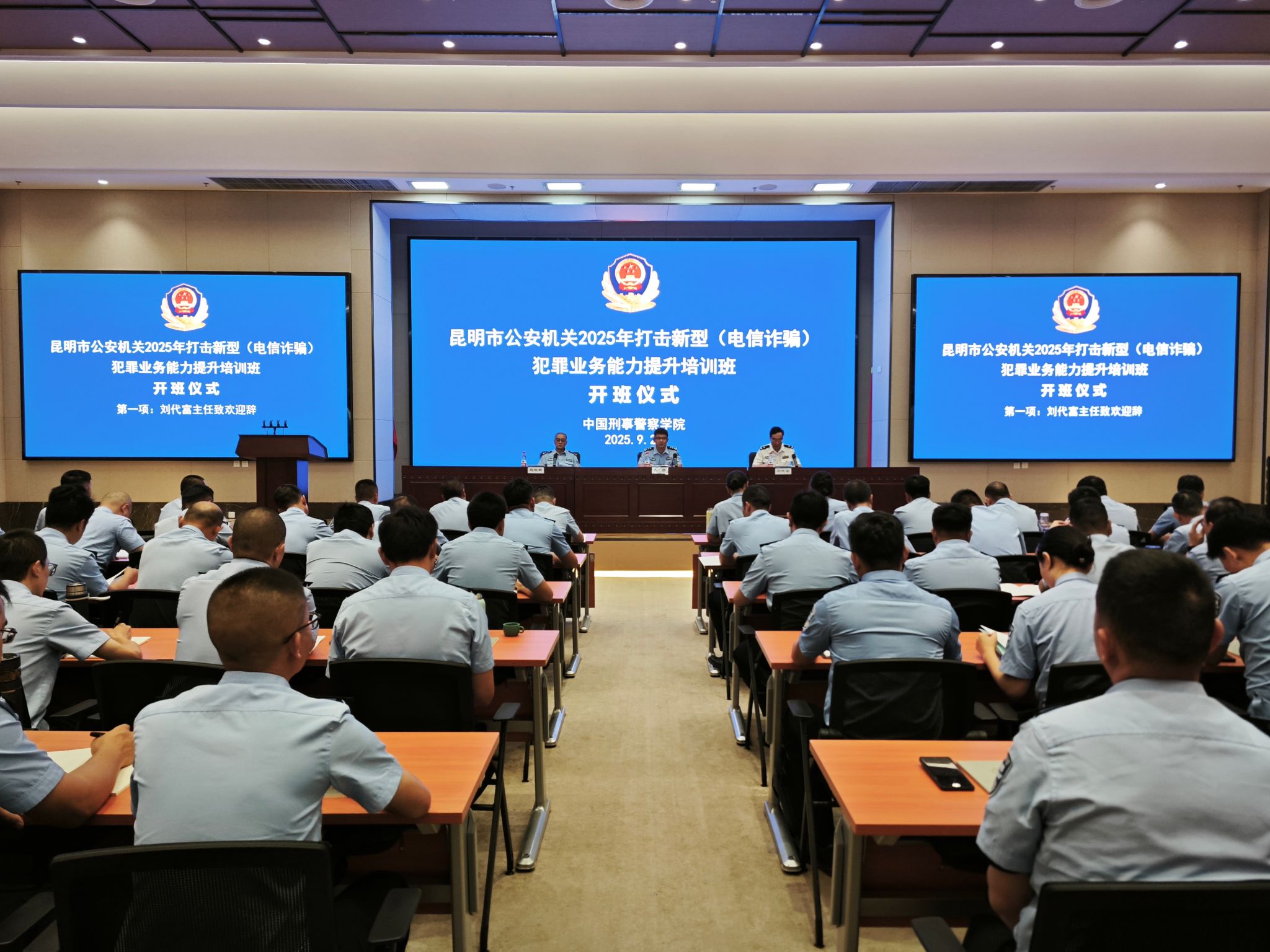 9月22日,昆明市公安机关2025年打击新型(电信诈骗)犯罪业务能力提升培训班在我校开班, 昆明市公安局刑事侦查支队副支队长李恒及学校培训部相关同志出席开班仪式,59名学员参加开班仪式。仪式由培训班班主任赵晓新主持,培训部主任刘代富致辞。