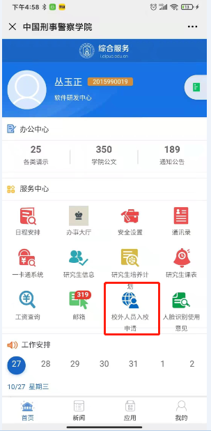 1.进入企业号,点击“A.综合服务”进入应用,在服务中心中能看到“校员人员入校申请”,点击该图标,生成入校申请二维码,将该二维码截图或直接发送给校外入校申请人;