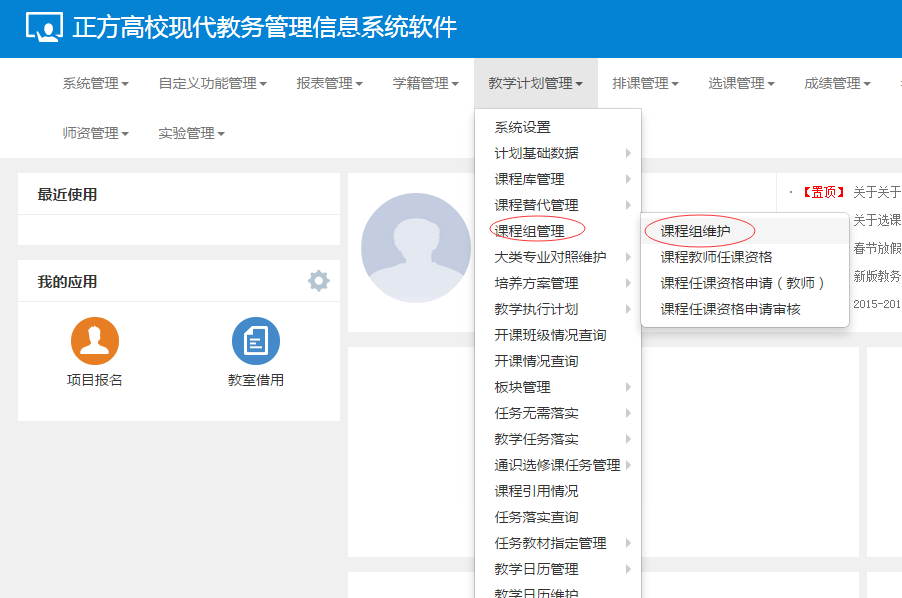 1.进入【教学计划管理】-【课程组管理】-【课程组维护】