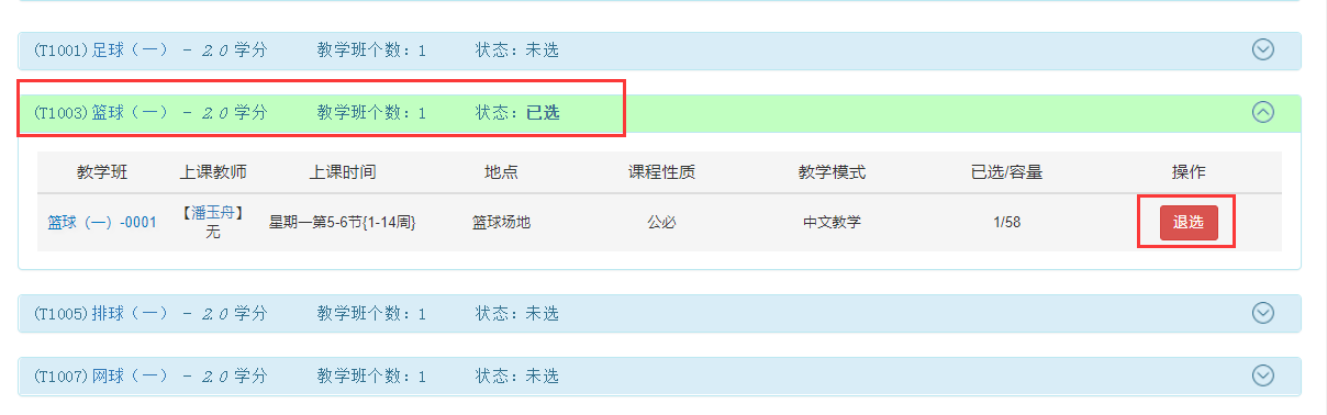 6.选中课程后,相应的页面颜色和按钮会有相应变化(若没有退选按钮未该轮选课不支持退选)