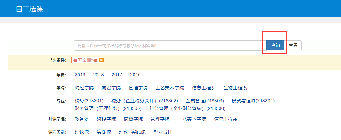 4.点击查询按钮后,筛选出所有可选择课程。也可以根据自己喜欢的课程名称筛选。