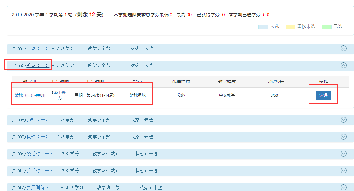 5.选择想要选择的项目,查看上课教师,上课时间地点后。可点击选课按钮进行选课